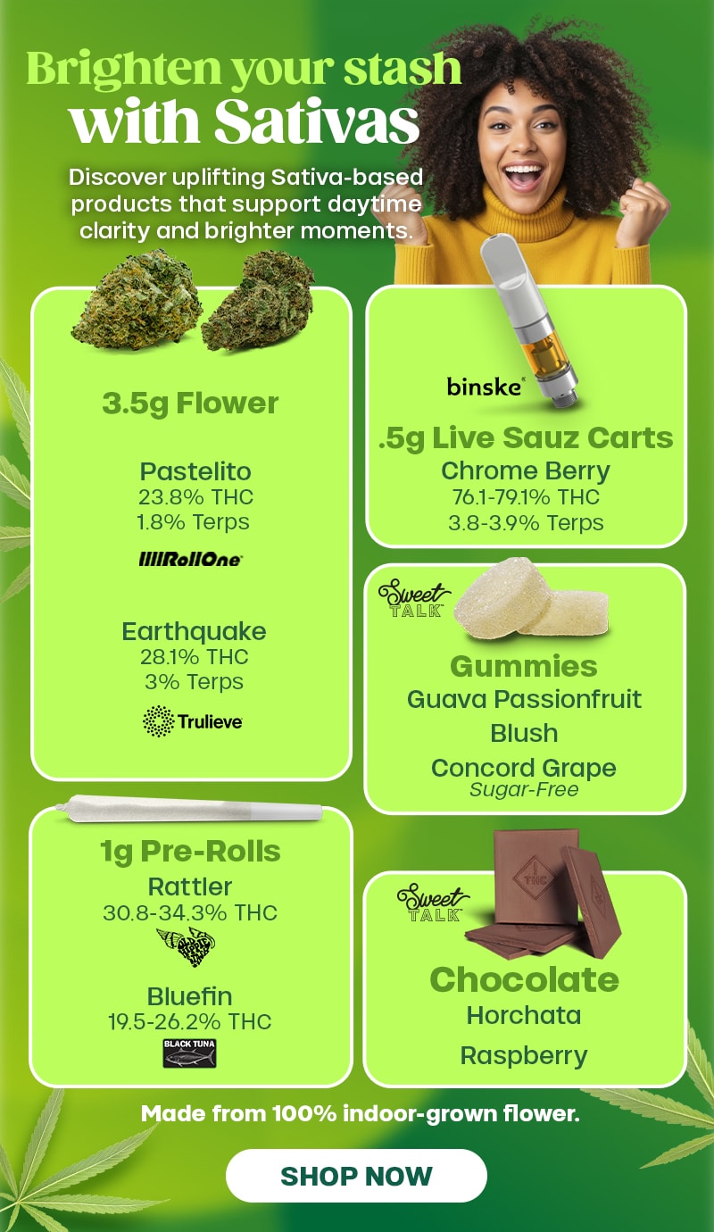 Fri-Sat Deals: Offer is valid 1/02/2026 – 1/03/2026 in Florida locations only. Orders must be placed by end of day on 1/03/2026 to qualify, store hours may vary. For delivery orders, orders must be placed by 1/03/2026 to qualify for savings. Seasonal vape & edibles promotions are applicable to select flavors and strains. Product will vary by location. In-store only. Cannot be combined with any other patient discounts, coupon, product promotion or sale. Employees are eligible for promotion. Offer has no cash value. Returns of any portion of the purchase will require equal forfeiture of offer or amount equal to offer. Trulieve, subsidiaries, affiliates, parent companies and third parties on behalf of Trulieve have the right to end or modify any offer at any time. Other restrictions may apply. Please see dispensary associate for more details. Product variety, availability, and THC% may vary by location.
