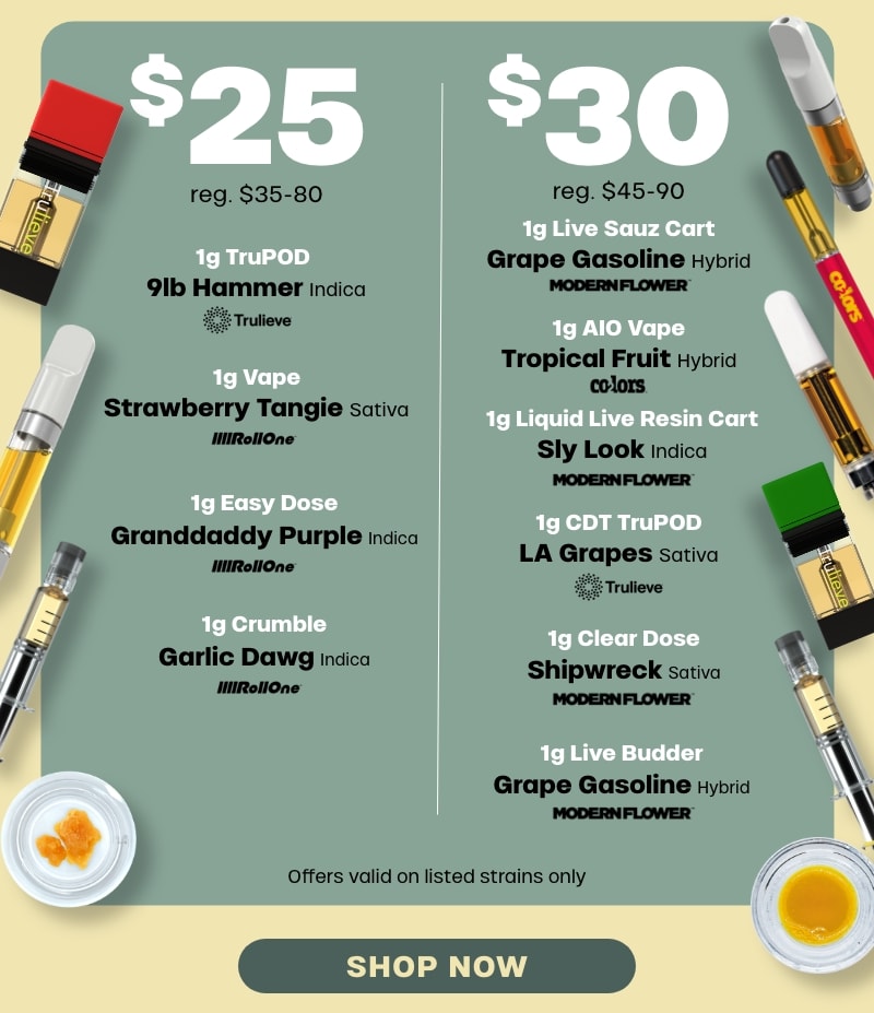 Fri-Sat Deals: Offer is valid 10/23/2025 12pm – 10/25/2025 in Florida locations only. Orders must be placed by end of day on 10/25/2025 to qualify, store hours may vary. For delivery orders, orders must be placed by 10/25/2025 to qualify for savings. Offer valid on select strains listed only, no substitutions. Edibles bundle promotion excludes 200mg chocolate. Cannot be combined with any other patient discounts, coupon, product promotion or sale. Employees are eligible for promotion. βOffer has no cash value. Returns of any portion of the purchase will require equal forfeiture of offer or amount equal to offer. Trulieve, subsidiaries, affiliates, parent companies and third parties on behalf of Trulieve have the right to end or modify any offer at any time. Other restrictions may apply. Please see dispensary associate for more details. Product variety, availability, and THC% may vary by location.ββββββββ