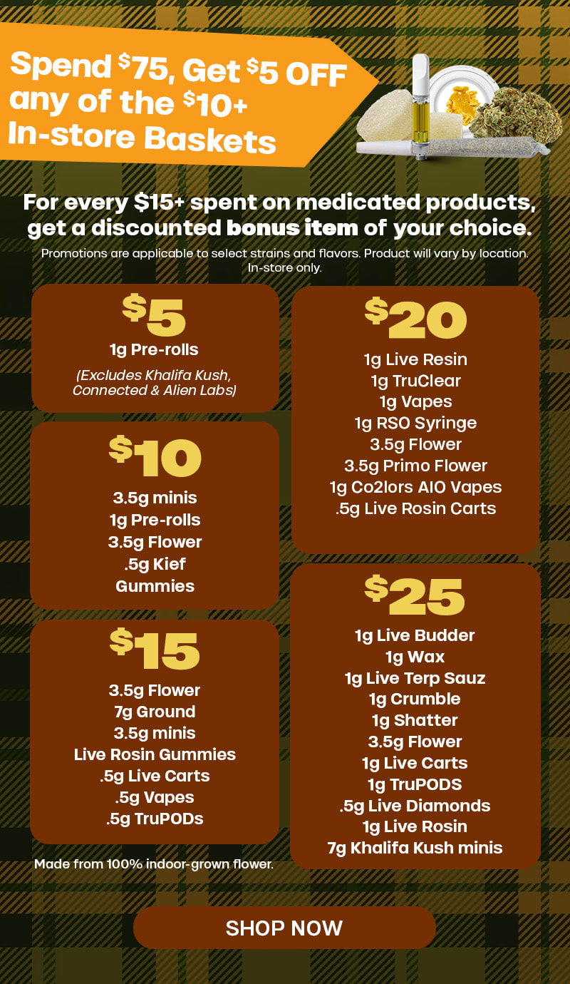 In-Store Basket Promo: Offer is valid 11/14/2025 – 11/16/2025 in Florida locations only. Orders must be picked up by end of day on 11/16/2025 to qualify, store hours may vary. For every $15 spent on medicated products, a customer can receive a select discounted product from the basket, in store only. Customer must spend $75 after discounts to get an additional $5 off of the $10+ in-store baskets. Cannot be combined with any other patient discounts, coupon, product promotion or sale. Employees are eligible for promotion. Offer has no cash value. Returns of any portion of the purchase will require equal forfeiture of offer or amount equal to offer. Trulieve, subsidiaries, affiliates, parent companies and third parties on behalf of Trulieve have the right to end or modify any offer at any time. Other restrictions may apply. Please see dispensary associate for more details. Product variety, availability, and THC% may vary by location.β βΒ