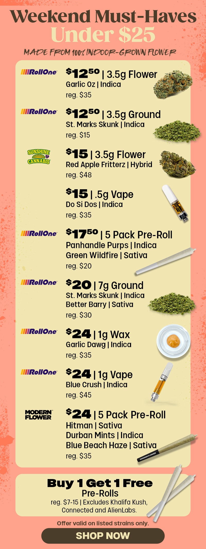 Fri-Sat | Under $25 Value Deals: Offer is valid 11/14/2025 – 11/15/2025 in Florida locations only. Orders must be placed by end of day on 11/15/2025 to qualify, store hours may vary. For delivery orders, orders must be placed by 11/15/2025 to qualify for savings. Offer valid on select strains listed only, no substitutions. Cannot be combined with any other patient discounts, coupon, product promotion or sale. Employees are eligible for promotion. βOffer has no cash value. Returns of any portion of the purchase will require equal forfeiture of offer or amount equal to offer. Trulieve, subsidiaries, affiliates, parent companies and third parties on behalf of Trulieve have the right to end or modify any offer at any time. Other restrictions may apply. Please see dispensary associate for more details. Product variety, availability, and THC% may vary by location.ββββΒ