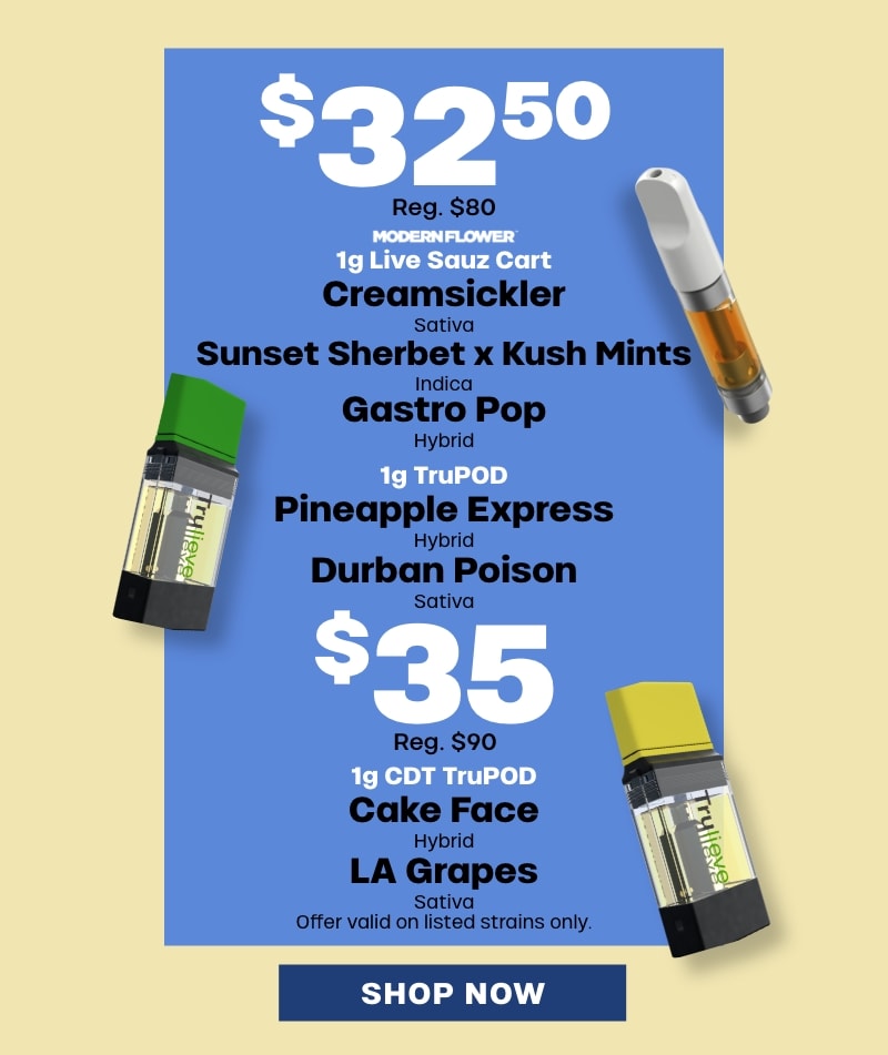 Fri-Sat Deals: Offer is valid 11/14/2025 – 11/15/2025 in Florida locations only. Orders must be placed by end of day on 11/15/2025 to qualify, store hours may vary. For delivery orders, orders must be placed by 11/15/2025 to qualify for savings. Offer valid on select strains listed only, no substitutions. Cannot be combined with any other patient discounts, coupon, product promotion or sale. Employees are eligible for promotion. Offer has no cash value. Returns of any portion of the purchase will require equal forfeiture of offer or amount equal to offer. Trulieve, subsidiaries, affiliates, parent companies and third parties on behalf of Trulieve have the right to end or modify any offer at any time. Other restrictions may apply. Please see dispensary associate for more details. Product variety, availability, and THC% may vary by Florida location.Β