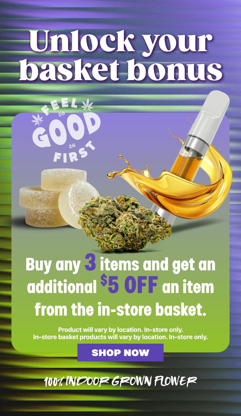 Basket Deals Promo: Offer is valid 1/26/2026 – 1/27/2026 in Florida locations only. Orders must be placed by end of day on 1/27/2026 to qualify, store hours may vary. Offer valid in-store only, basket product will vary by location. Cannot be combined with any other patient discounts, coupon, product promotion or sale. Employees are eligible for promotion. Offer has no cash value. Returns of any portion of the purchase will require equal forfeiture of offer or amount equal to offer. Trulieve, subsidiaries, affiliates, parent companies and third parties on behalf of Trulieve have the right to end or modify any offer at any time. Other restrictions may apply. Please see dispensary associate for more details. Product variety, availability, and THC% may vary by location.