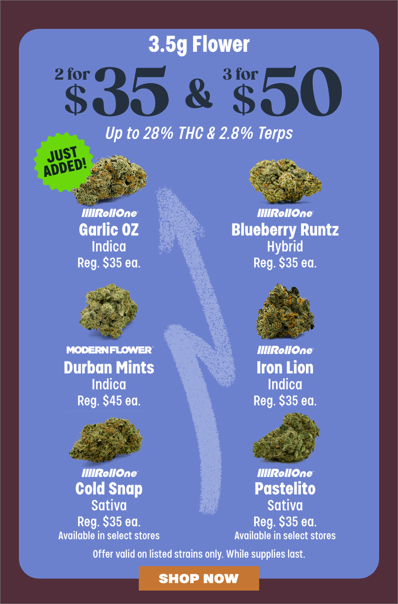 Mon-Tue Deals: Offer is valid 1/26/2026 – 1/27/2026 in Florida locations only. Orders must be placed by end of day on 1/27/2026 to qualify, store hours may vary. For delivery orders, orders must be placed by 1/27/2026 to qualify for savings. Offer valid on listed strains only, no substitutions. Cannot be combined with any other patient discounts, coupon, product promotion or sale. Employees are eligible for promotion. Offer has no cash value. Returns of any portion of the purchase will require equal forfeiture of offer or amount equal to offer. Trulieve, subsidiaries, affiliates, parent companies and third parties on behalf of Trulieve have the right to end or modify any offer at any time. Other restrictions may apply. Please see dispensary associate for more details. Product variety, availability, and THC% may vary by location.