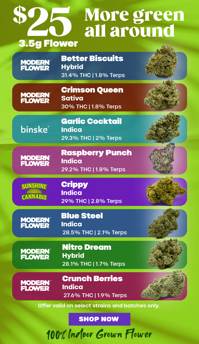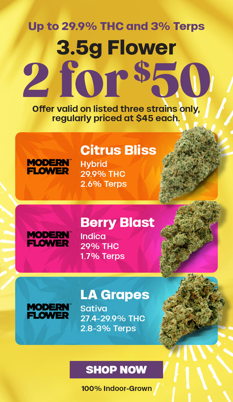 2 for $50 3.5g Flower: Offer is valid 3/3/2026 at 4pm – 3/5/2026 in Florida locations only. Orders must be placed by end of day on 3/5/2026 to qualify, store hours may vary. For delivery orders, orders must be placed by 3/5/2026 to qualify for savings. Offer valid on listed strains only, no substitutions, while supplies last. Cannot be combined with any other patient discounts, coupon, product promotion or sale. Employees are eligible for promotion. Offer has no cash value. Returns of any portion of the purchase will require equal forfeiture of offer or amount equal to offer. Trulieve, subsidiaries, affiliates, parent companies and third parties on behalf of Trulieve have the right to end or modify any offer at any time. Other restrictions may apply. Please see dispensary associate for more details. Product variety, availability, and THC% may vary by location.