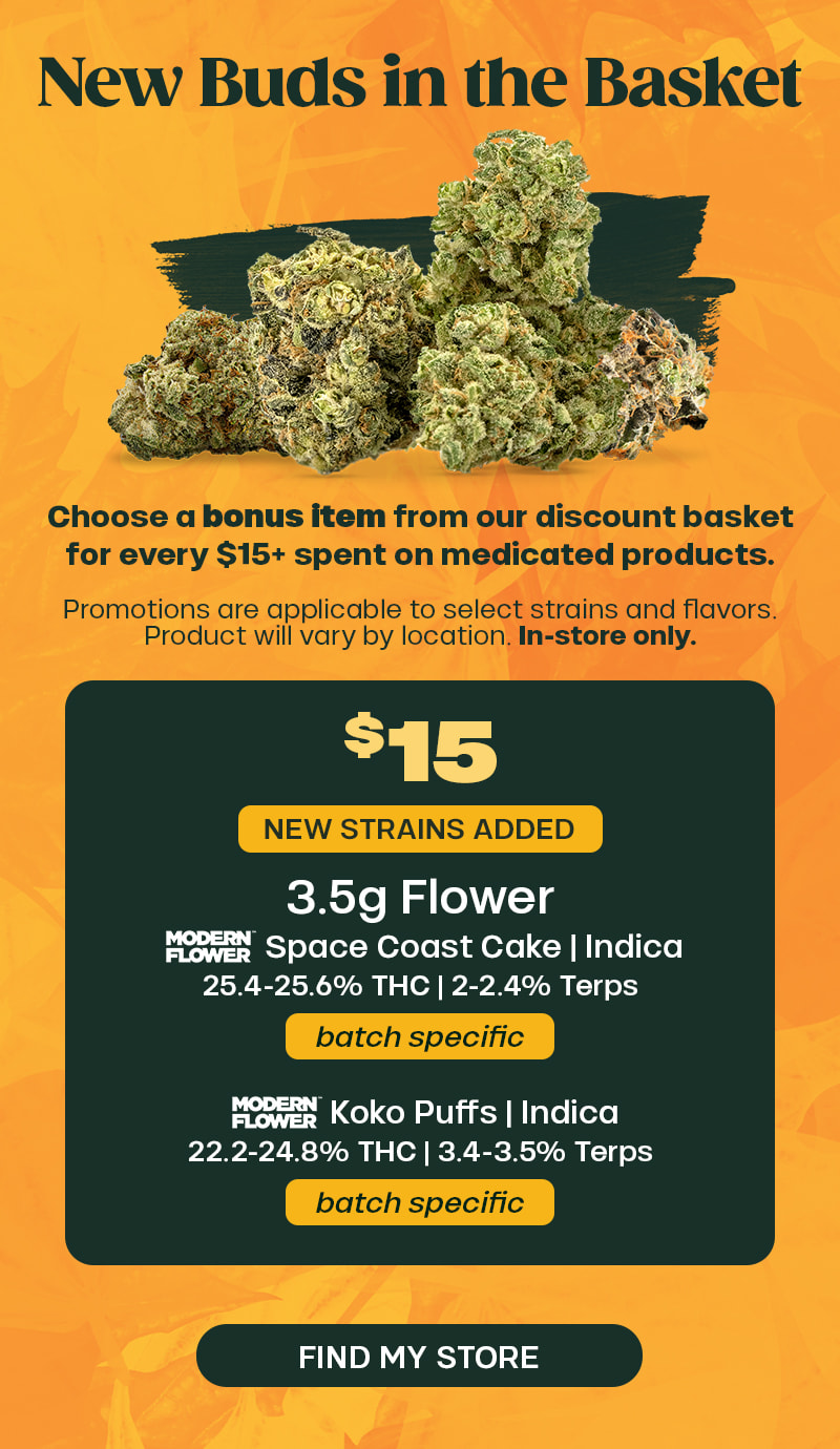 Basket Additions: Offer is valid 10/1/2025 – 10/31/2025 in Florida locations only. Orders must be picked up by end of day on 10/31/2025 to qualify, store hours may vary. For every $15 spent on medicated products, a customer can receive a select discounted product from the basket, in store only. Cannot be combined with any other patient discounts, coupon, product promotion or sale. Employees are eligible for promotion. Offer has no cash value. Returns of any portion of the purchase will require equal forfeiture of offer or amount equal to offer. Trulieve, subsidiaries, affiliates, parent companies and third parties on behalf of Trulieve have the right to end or modify any offer at any time. Other restrictions may apply. Please see dispensary associate for more details. Product variety, availability, and THC% may vary by location.β βΒ