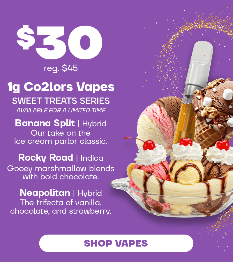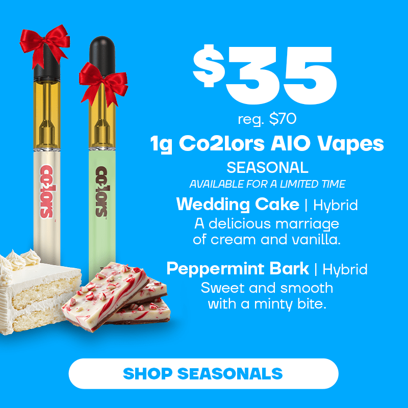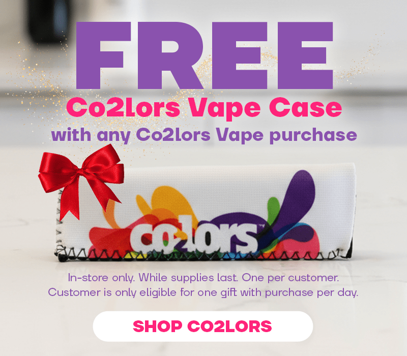 Co2lors GWP + Promos: Offer is valid 12/16/2025 in Florida locations only. Orders must be placed by end of day on 12/16/2025 to qualify, store hours may vary. For delivery orders, orders must be placed by 12/16/2025 to qualify for savings. Gift with purchase available in-store while supplies last. Customer must purchase a vape from Co2lors to receive the free gift. First come first serve, one gift per customer. Customer is only eligible for one gift with purchase per day. Cannot be combined with any other patient discounts, coupon, product promotion or sale. Employees are eligible for promotion. βOffer has no cash value. Returns of any portion of the purchase will require equal forfeiture of offer or amount equal to offer. Trulieve, subsidiaries, affiliates, parent companies and third parties on behalf of Trulieve have the right to end or modify any offer at any time. Other restrictions may apply. Please see dispensary associate for more details. Product variety, availability, and THC% may vary by location.ββββββββΒ