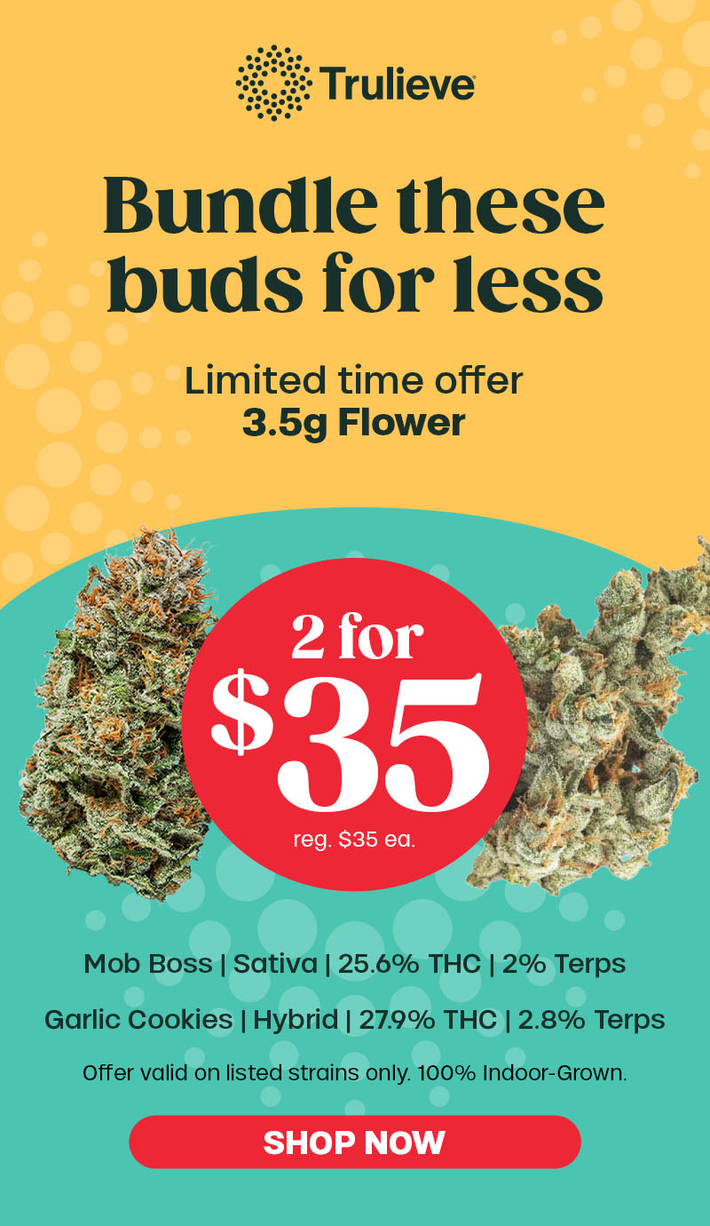 Trulieve Flower Bundle: Offer is valid 1/12/2026 – 1/13/2026 in Florida locations only. Orders must be placed by end of day on 1/13/2026 to qualify, store hours may vary. For delivery orders, orders must be placed by 1/13/2026 to qualify for savings. Offer valid on listed strains only, no substitutions. Cannot be combined with any other patient discounts, coupon, product promotion or sale. Employees are eligible for promotion. Offer has no cash value. Returns of any portion of the purchase will require equal forfeiture of offer or amount equal to offer. Trulieve, subsidiaries, affiliates, parent companies and third parties on behalf of Trulieve have the right to end or modify any offer at any time. Other restrictions may apply. Please see dispensary associate for more details. Product variety, availability, and THC% may vary by location.