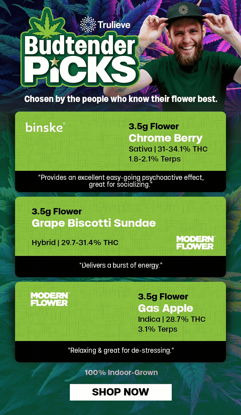 Mon-Tue Deals: Offer is valid 3/9/2026 – 3/10/2026 in Florida locations only. Orders must be placed by end of day on 3/10/2026 to qualify, store hours may vary. For delivery orders, orders must be placed by 3/10/2026 to qualify for savings. Cannot be combined with any other patient discounts, coupon, product promotion or sale. Employees are eligible for promotion. Offer has no cash value. Returns of any portion of the purchase will require equal forfeiture of offer or amount equal to offer. Trulieve, subsidiaries, affiliates, parent companies and third parties on behalf of Trulieve have the right to end or modify any offer at any time. Other restrictions may apply. Please see dispensary associate for more details. Product variety, availability, and THC% may vary by location.