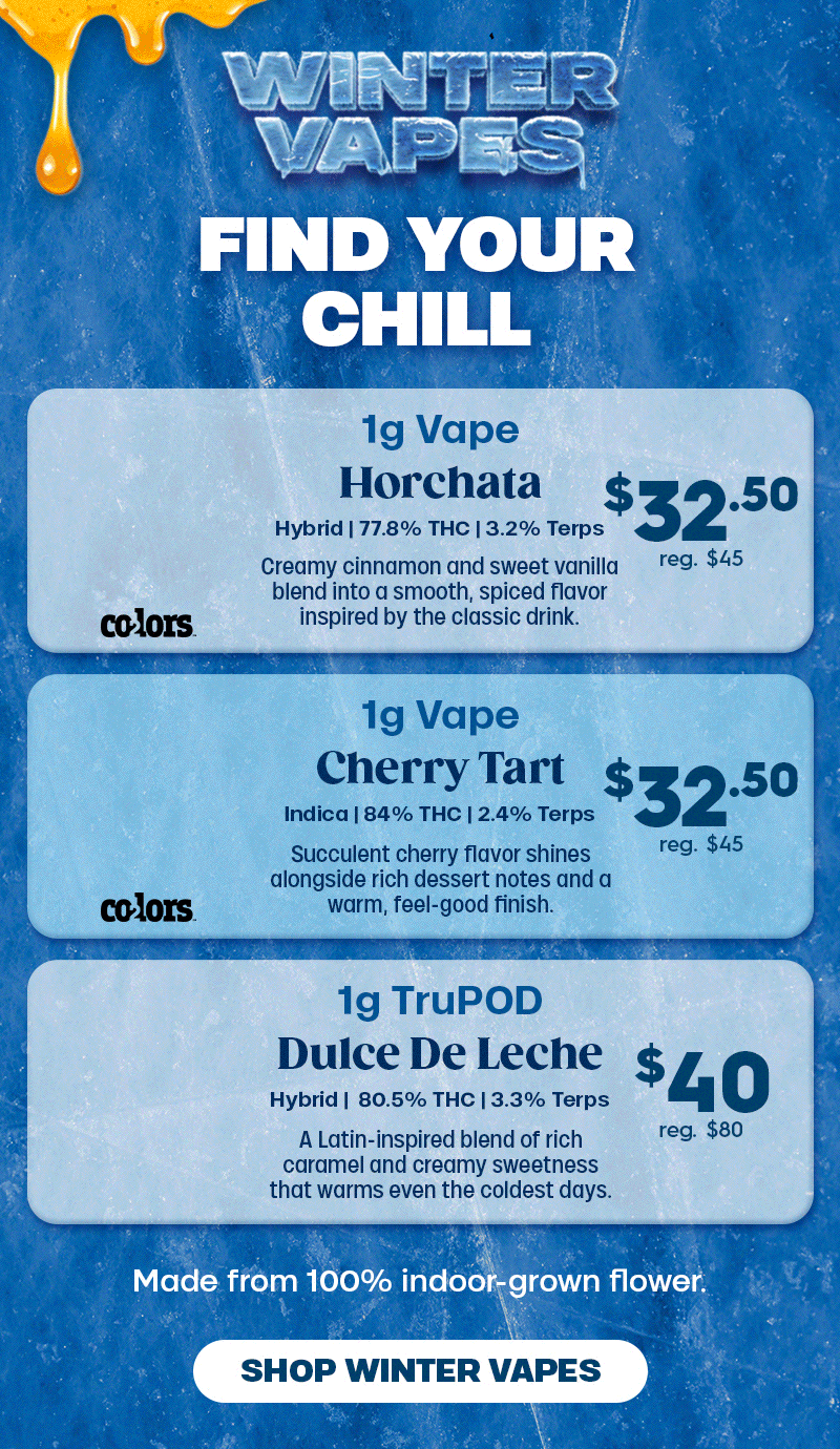 Winter Vape Series: Offer is valid 1/13/2026 in Florida locations only. Orders must be placed by end of day on 1/13/2026 to qualify, store hours may vary. For delivery orders, orders must be placed by 1/13/2026 to qualify for savings. Cannot be combined with any other patient discounts, coupon, product promotion or sale. Employees are eligible for promotion. Offer has no cash value. Returns of any portion of the purchase will require equal forfeiture of offer or amount equal to offer. Trulieve, subsidiaries, affiliates, parent companies and third parties on behalf of Trulieve have the right to end or modify any offer at any time. Other restrictions may apply. Please see dispensary associate for more details. Product variety, availability, and THC% may vary by location.