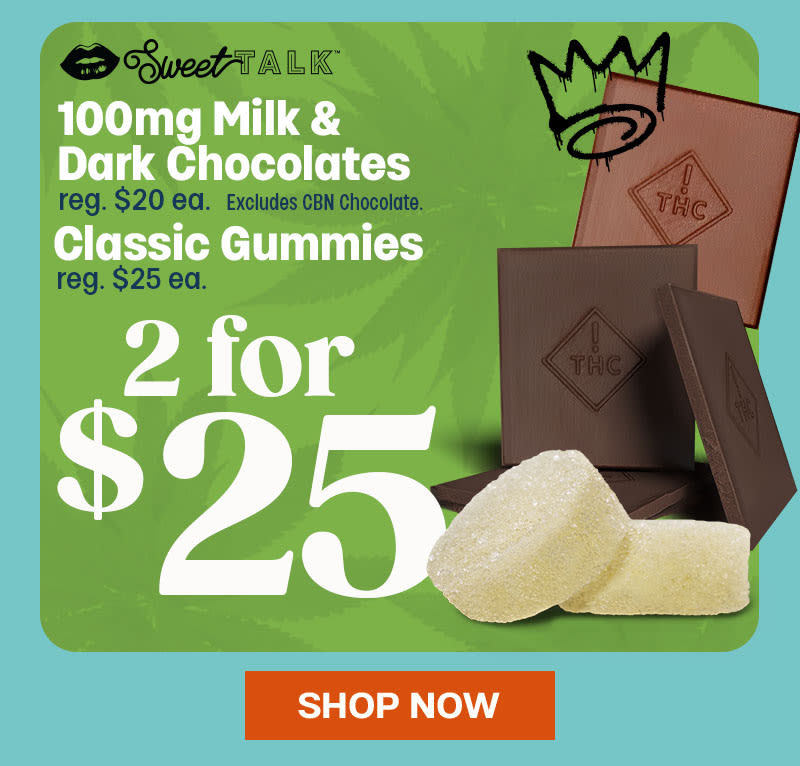 Wed-Thu Deals: Offer is valid 3/11/2026 – 3/12/2026 in Florida locations only. Orders must be placed by end of day on 3/12/2026 to qualify, store hours may vary. For delivery orders, orders must be placed by 3/12/2026 to qualify for savings. Edibles bundle. excludes CBN chocolate. Cannot be combined with any other patient discounts, coupon, product promotion or sale. Employees are eligible for promotion. Offer