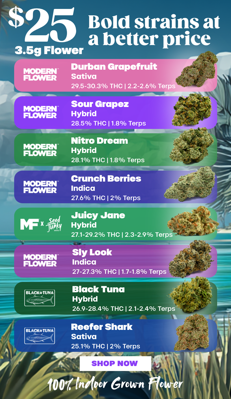 2 for $50 3.5g Flower: Offer is valid 3/11/2026 – 3/12/2026 in Florida locations only. Orders must be placed by end of day on 3/12/2026 to qualify, store hours may vary. For delivery orders, orders must be placed by 3/12/2026 to qualify for savings. Offer valid on listed strains only, no substitutions, while supplies last. Cannot be combined with any other patient discounts, coupon, product promotion or sale. Employees are eligible for promotion. Offer has no cash value. Returns of any portion of the purchase will require equal forfeiture of offer or amount equal to offer. Trulieve, subsidiaries, affiliates, parent companies and third parties on behalf of Trulieve have the right to end or modify any offer at any time. Other restrictions may apply. Please see dispensary associate for more details. Product variety, availability, and THC% may vary by location.
