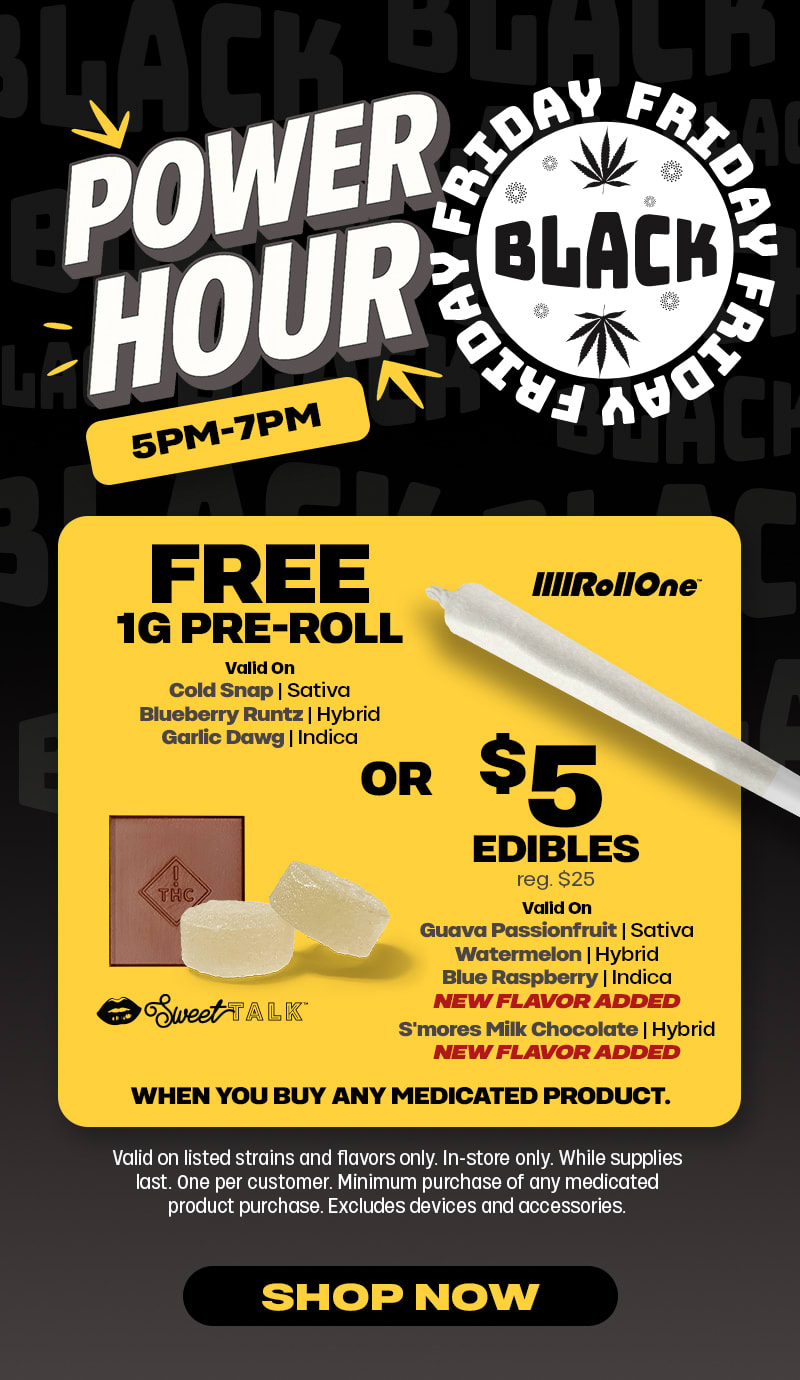 Power Hour | EXTENDED: Offer is valid 11/28/2025 from 5pm-7pm EST on 11/28/2025 in Florida locations only. Orders must be placed by 7pm EST on 11/28/2025 to qualify, store hours may vary. Delivery orders not available, in-store only. Valid on select strains and flavors only, no substitutions. While supplies last. One per customer. Minimum purchase of any medicated product purchase. Cannot be combined with any other patient discounts, coupon, product promotion or sale. Employees are eligible for promotion. Offer has no cash value. Returns of any portion of the purchase will require equal forfeiture of offer or amount equal to offer. Trulieve, subsidiaries, affiliates, parent companies and third parties on behalf of Trulieve have the right to end or modify any offer at any time. Other restrictions may apply. Please see dispensary associate for more details. Product variety, availability, and THC% may vary by location.
