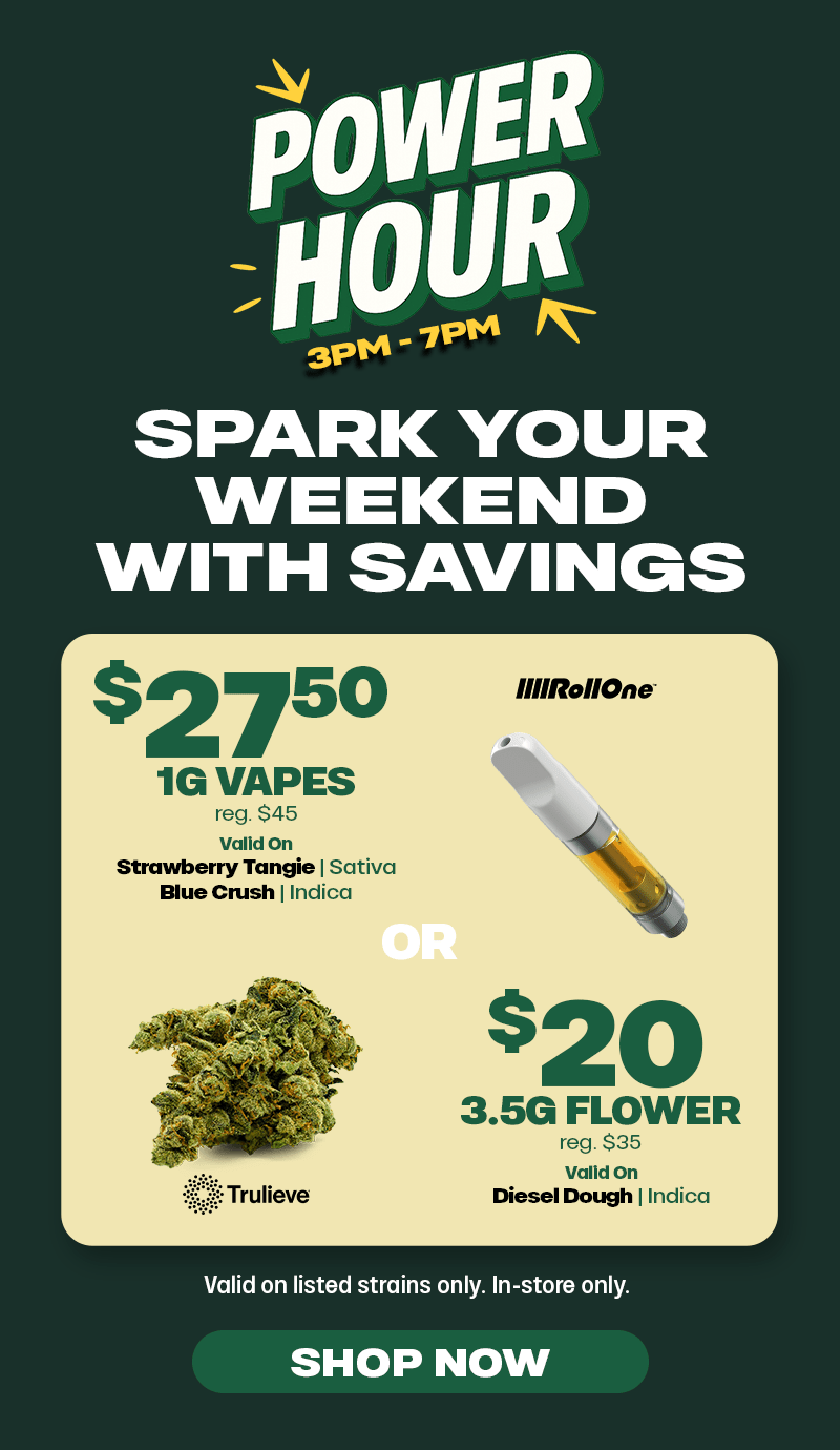 | All Weekend: 35% Off All Flower / 25% off All Vapes | ||||||||||||||||||
