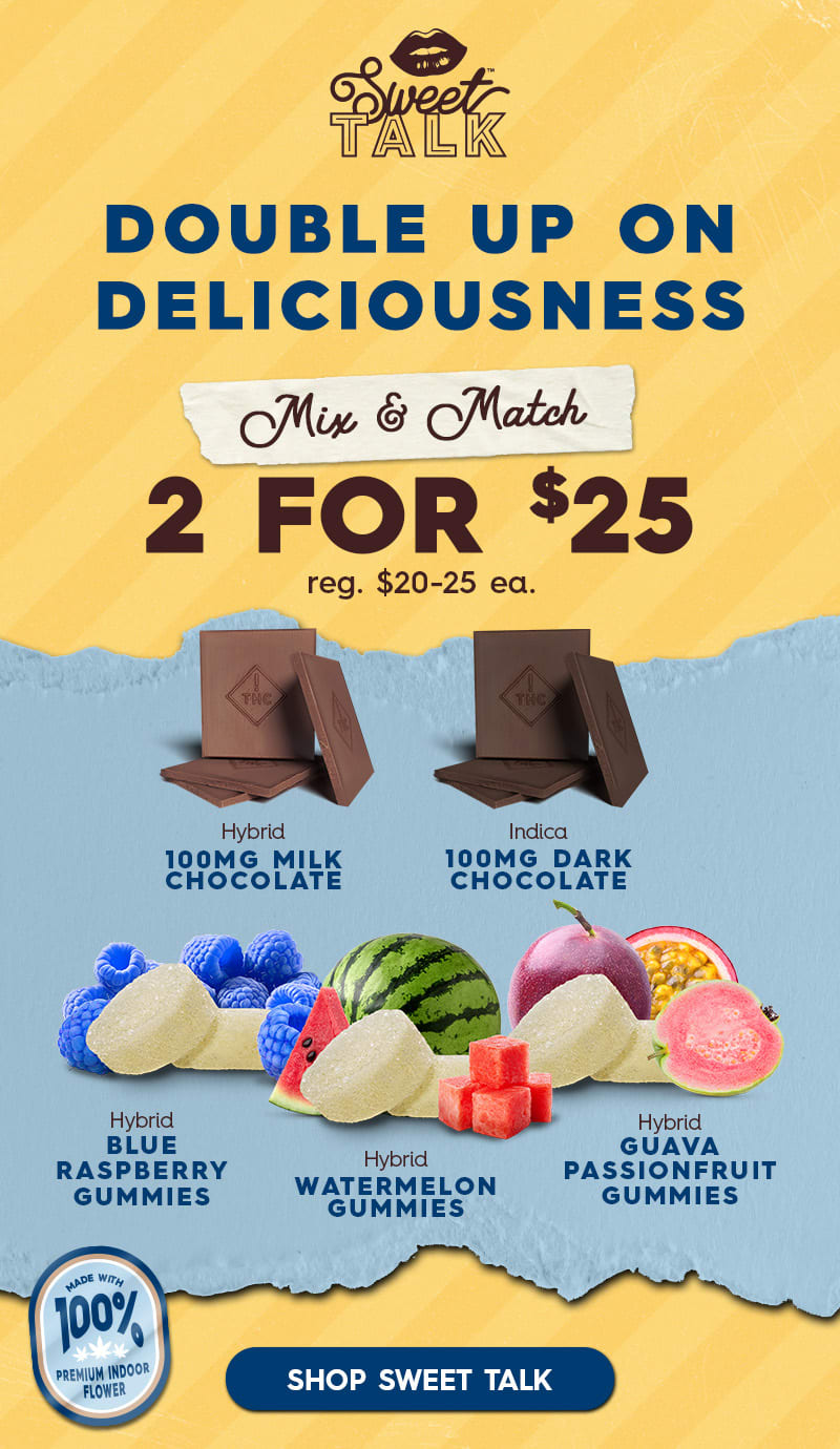 2 for $25 Sweet Talk:Β Offer is valid 3/11/2026 – 3/12/2026 in Florida locations only. Orders must be placed by end of day on 3/12/2026 to qualify, store hours may vary. For delivery orders, orders must be placed by 3/12/2026 to qualify for savings. Edibles bundle. excludes CBN chocolate. Cannot be combined with any other patient discounts, coupon, product promotion or sale. Employees are eligible for promotion. Offer has no cash value. Returns of any portion of the purchase will require equal forfeiture of offer or amount equal to offer. Trulieve, subsidiaries, affiliates, parent companies and third parties on behalf of Trulieve have the right to end or modify any offer at any time. Other restrictions may apply. Please see dispensary associate for more details. Product variety, availability, and THC% may vary by location.