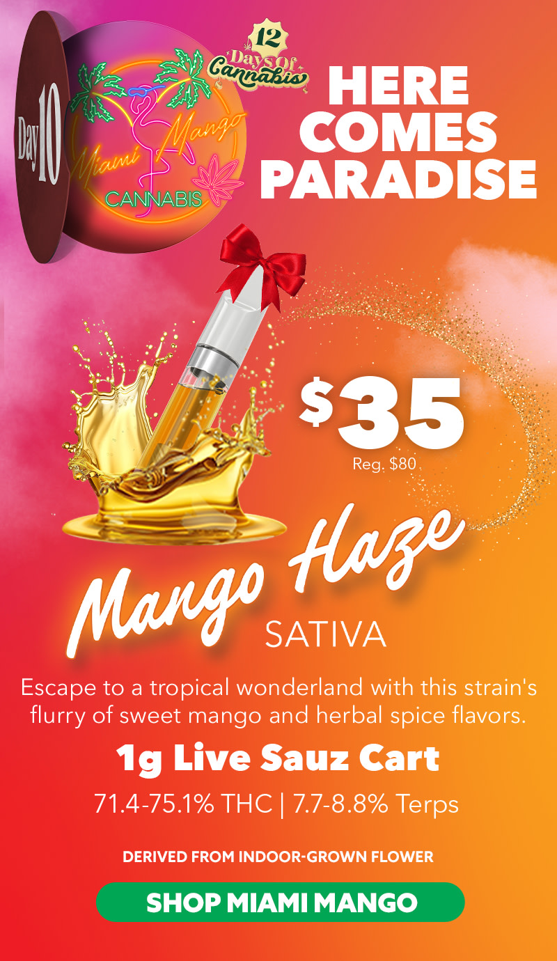 Miami Mango | 12 Days: Offer is valid 12/22/2025 in Florida locations only. Orders must be placed by end of day on 12/22/2025 to qualify, store hours may vary. For delivery orders, orders must be placed by 12/22/2025 to qualify for savings. Cannot be combined with any other patient discounts, coupon, product promotion or sale. Employees are eligible for promotion. Offer has no cash value. Returns of any portion of the purchase will require equal forfeiture of offer or amount equal to offer. Trulieve, subsidiaries, affiliates, parent companies and third parties on behalf of Trulieve have the right to end or modify any offer at any time. Other restrictions may apply. Please see dispensary associate for more details. Product variety, availability, and THC% may vary by location.
