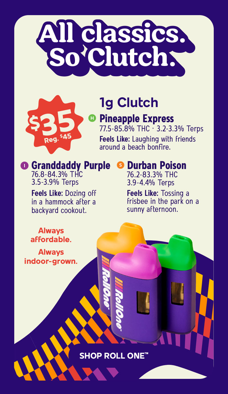 RO Clutch:Β Offer is valid 1/29/2026 in Florida locations only. Orders must be placed by end of day on 1/29/2026 to qualify, store hours may vary. For delivery orders, orders must be placed by 1/29/2026 to qualify for savings. Cannot be combined with any other patient discounts, coupon, product promotion or sale. Employees are eligible for promotion. βOffer has no cash value. Returns of any portion of the purchase will require equal forfeiture of offer or amount equal to offer. Trulieve, subsidiaries, affiliates, parent companies and third parties on behalf of Trulieve have the right to end or modify any offer at any time. Other restrictions may apply. Please see dispensary associate for more details. Product variety, availability, and THC% may vary by location.βββββ