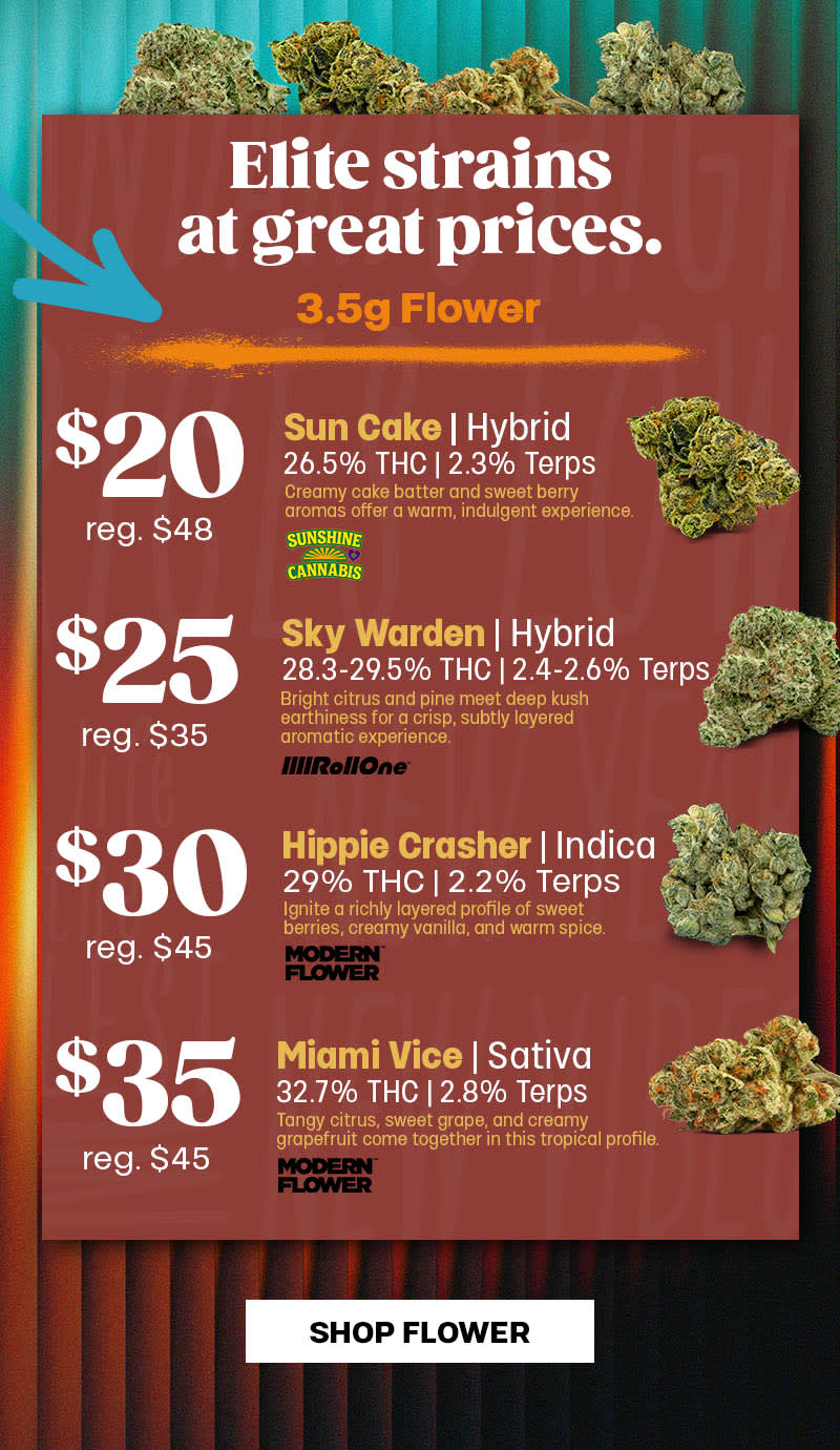 Wed-Thu Deals:Β Offer is valid 1/28/2026 – 1/29/2026 in Florida locations only. Orders must be placed by end of day on 1/29/2026 to qualify, store hours may vary. For delivery orders, orders must be placed by 1/29/2026 to qualify for savings. Offer valid on listed strains only, no substitutions. Cannot be combined with any other patient discounts, coupon, product promotion or sale. Employees are eligible for promotion. βOffer has no cash value. Returns of any portion of the purchase will require equal forfeiture of offer or amount equal to offer. Trulieve, subsidiaries, affiliates, parent companies and third parties on behalf of Trulieve have the right to end or modify any offer at any time. Other restrictions may apply. Please see dispensary associate for more details. Product variety, availability, and THC% may vary by location.ββββ
