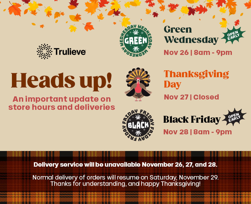 Trulieve Perks: Offer is valid 11/24/2025 – 12/31/2025. Earn one custom stamp for every transaction. One transaction limit per medical customer per day. After the sixth stamp, medical customers can redeem their Trulieve Perks card for $50 off their next $100 purchase. The $100 minimum purchase is after discounts are applied. The discount can be used on all products except devices and accessories. Discount must be redeemed by December 31, 2025. A medical customer may receive up to two cards maximum during the campaign duration. Completed Trulieve Holiday Savings cards must be forfeited before receiving a new Trulieve Holiday Savings card. Trulieve Holiday Savings card and discount cannot be exchanged for store credit or cash. Duplicated cards will not be accepted. Lost or stolen cards will not be replaced. Void where prohibited, taxed, or otherwise restricted. This promotion has no cash value. Returns of any portion of the purchase will require equal forfeiture of offer or amount equal to offer. Trulieve has the right to end or modify the promotion at any time. Other restrictions may apply.