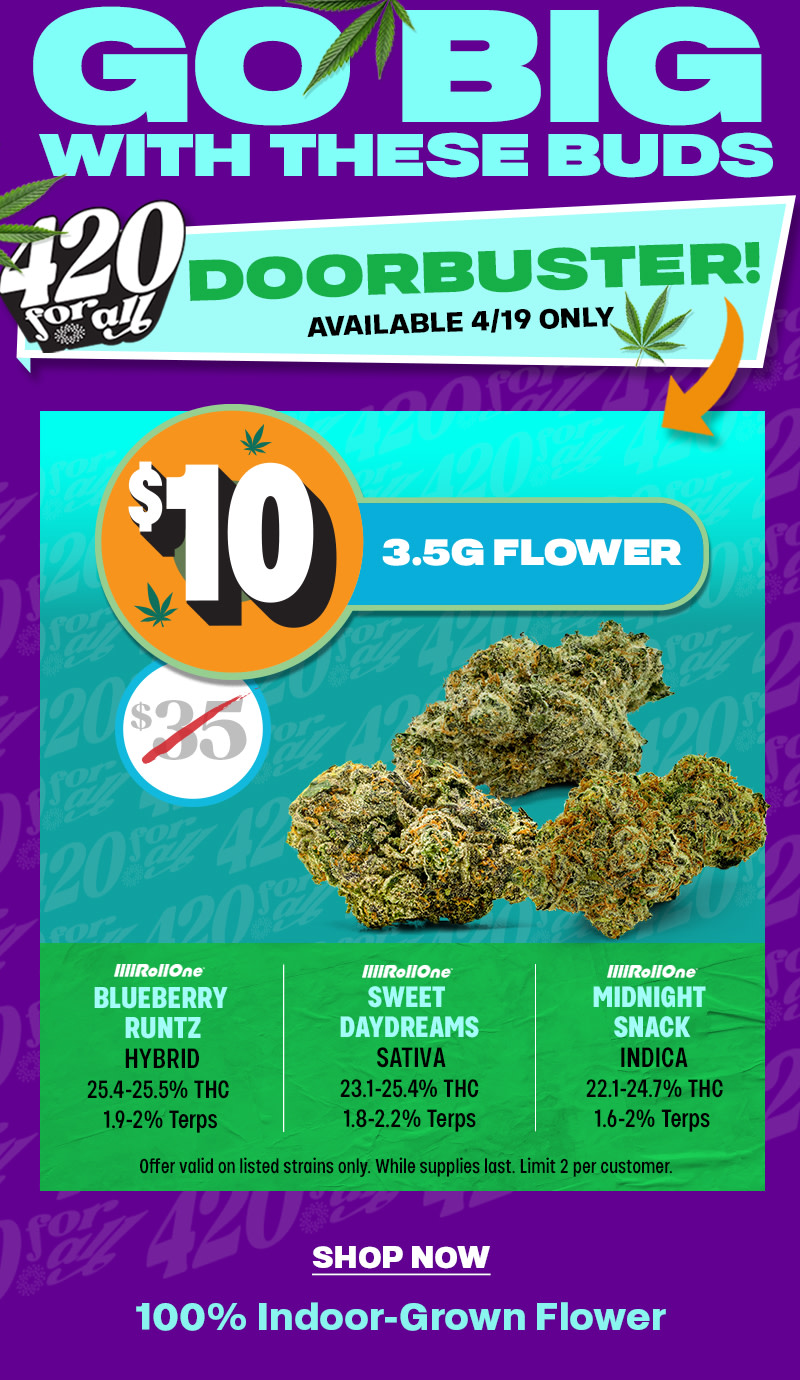 $10 3.5g Flower Doorbuster | SUNDAY: Offer is valid 4/19/2025 in Florida locations only. Orders must be placed by end of day on 4/19/2025 to qualify, store hours may vary. For delivery orders, orders must be placed by 4/19/2025 to qualify for savings. Offer valid on listed strain only, no substitutions. Limit 2 per customer. Cannot be combined with any other patient discounts, coupon, product promotion or sale. Offer has no cash value. Returns of any portion of the purchase will require equal forfeiture of offer or amount equal to offer. Trulieve, subsidiaries, affiliates, parent companies and third parties on behalf of Trulieve have the right to end or modify any offer at any time. Other restrictions may apply. Please see dispensary associate for more details. Product variety, availability, and THC% may vary by location.