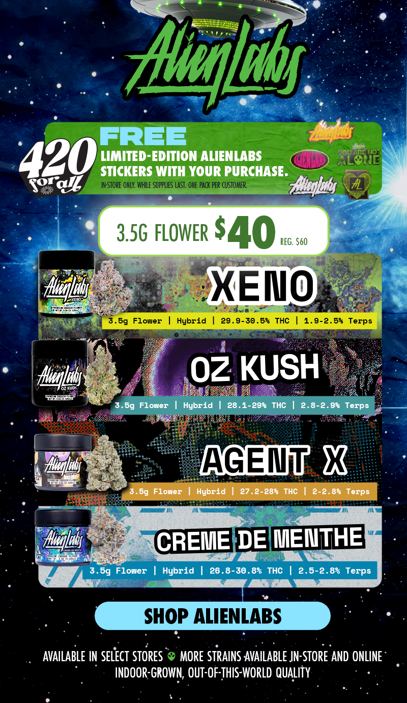 AlienLabs | 420: Offer is valid 4/19/2026 in Florida locations only. Orders must be placed by end of day on 4/19/2026β€Œ to qualify, store hours may vary. For delivery orders, orders must be placed by 4/19/2026β€Œ to qualify for savings. Gift with purchase available in-store while supplies last. Customer must purchase a AlienLabs product to receive the free gift. First come first serve, one gift per patient. β€ŒCannot be combined with any other patient discounts, coupon, product promotion or sale. Employees are eligible for promotion. Offer has no cash value. Returns of any portion of the purchase will require equal forfeiture of offer or amount equal to offer. Trulieve, subsidiaries, affiliates, parent companies and third parties on behalf of Trulieve have the right to end or modify any offer at any time. Other restrictions may apply. Please see dispensary associate for more details. Product variety, availability, and THC% may vary by location.β€Œ