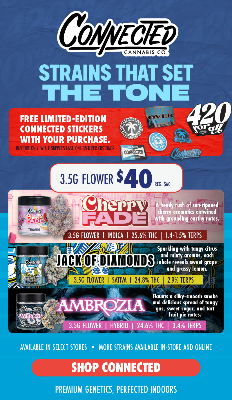 Connected | 420: Offer is valid 4/19/2026 in Florida locations only. Orders must be placed by end of day on 4/19/2026β€Œ to qualify, store hours may vary. For delivery orders, orders must be placed by 4/19/2026β€Œ to qualify for savings. Gift with purchase available in-store while supplies last. Customer must purchase a Connected product to receive the free gift. First come first serve, one gift per patient. β€ŒCannot be combined with any other patient discounts, coupon, product promotion or sale. Employees are eligible for promotion. Offer has no cash value. Returns of any portion of the purchase will require equal forfeiture of offer or amount equal to offer. Trulieve, subsidiaries, affiliates, parent companies and third parties on behalf of Trulieve have the right to end or modify any offer at any time. Other restrictions may apply. Please see dispensary associate for more details. Product variety, availability, and THC% may vary by location.β€Œ