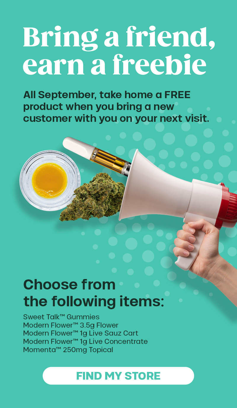 Bring a Bud: Offer valid 9/1/2025 – 9/30/2025 in Trulieve locations in Florida. To be eligible, the referring customer must be with the new customer at the time of their first purchase. Referring customer can receive one free product from pre-selected items: Sweet Talk Gummies (reg. $25), MF 3.5g Flower, MF 1g Live Sauz Cart, MF 1g Live Concentrates, Momenta Topical. Limit one free product per referral. No product substitutions. Cannot be combined with any other discounts, coupon, promotion, or sale. Offer has no cash value. Returns of any portion of the purchase will require equal forfeiture of offer or amount equal to offer. Trulieve reserves the right to change or adjust this discount.Β