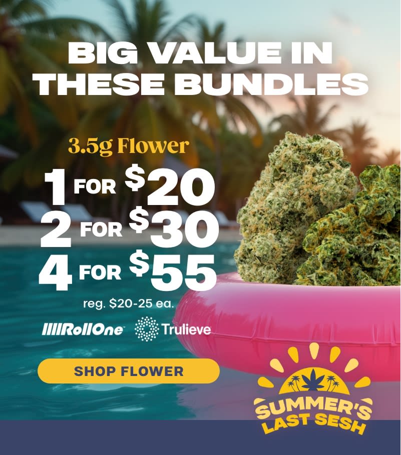 Mon-Tue Deals: Offer is valid 9/22/2025 – 9/23/2025 in Florida locations only. Orders must be placed by end of day on 9/23/2025 to qualify, store hours may vary. For delivery orders, orders must be placed by 9/23/2025 to qualify for savings. Cannot be combined with any other patient discounts, coupon, product promotion or sale. Offer has no cash value. Employees are eligible for promotion. β€ŒReturns of any portion of the purchase will require equal forfeiture of offer or amount equal to offer. Trulieve, subsidiaries, affiliates, parent companies and third parties on behalf of Trulieve have the right to end or modify any offer at any time. Other restrictions may apply. Please see dispensary associate for more details. Product variety, availability, and THC% may vary by location.β€Œβ€Œβ€Œβ€Œβ€ŒΒ