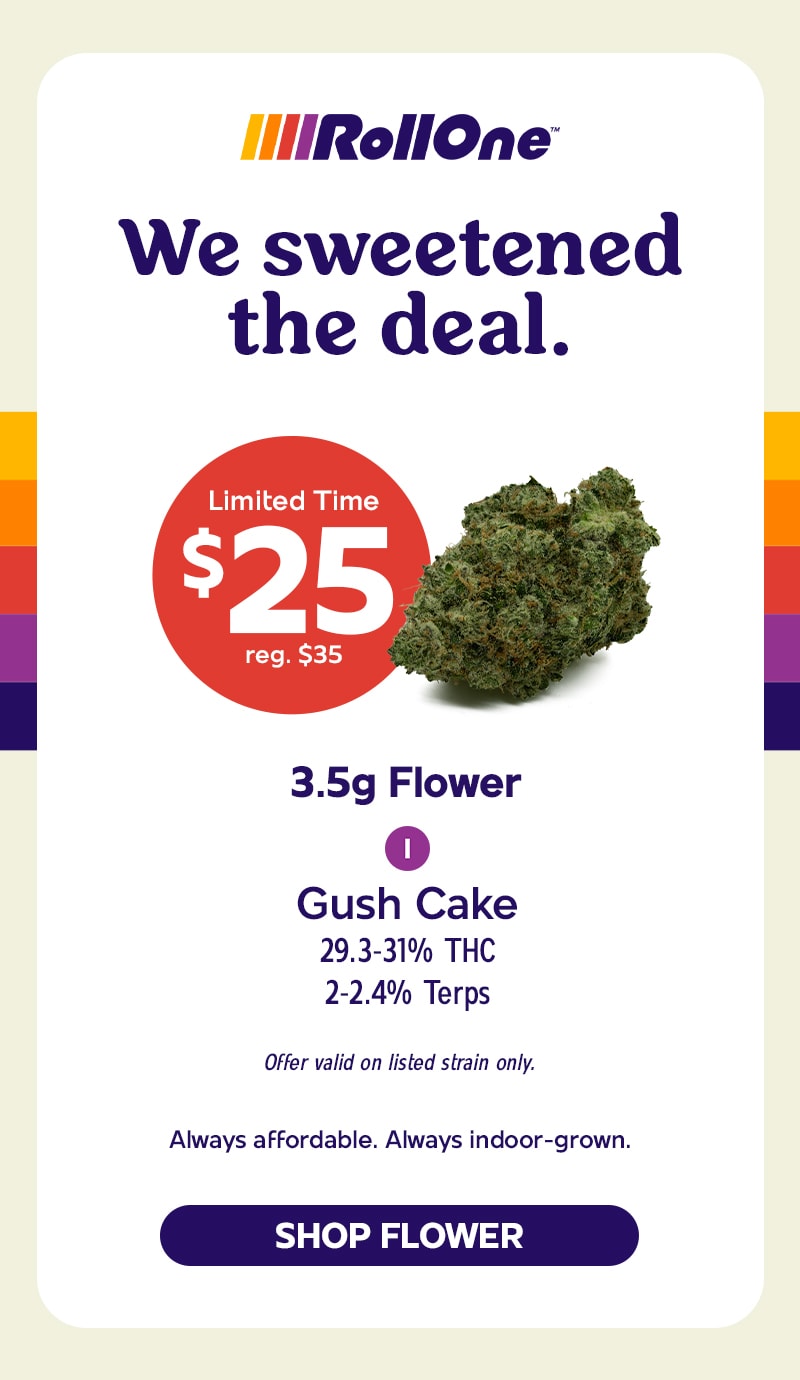 RO Gush Cake: Offer is valid 1/2/2026 at 12pm – 1/4/2026 in Florida locations only. Orders must be placed by end of day on 1/4/2026 to qualify, store hours may vary. For delivery orders, orders must be placed by 1/4/2026 to qualify for savings. Offer valid on listed strain only, no substitutions. Cannot be combined with any other patient discounts, coupon, product promotion or sale. Employees are eligible for promotion. Offer has no cash value. Returns of any portion of the purchase will require equal forfeiture of offer or amount equal to offer. Trulieve, subsidiaries, affiliates, parent companies and third parties on behalf of Trulieve have the right to end or modify any offer at any time. Other restrictions may apply. Please see dispensary associate for more details. Product variety, availability, and THC% may vary by location.ย