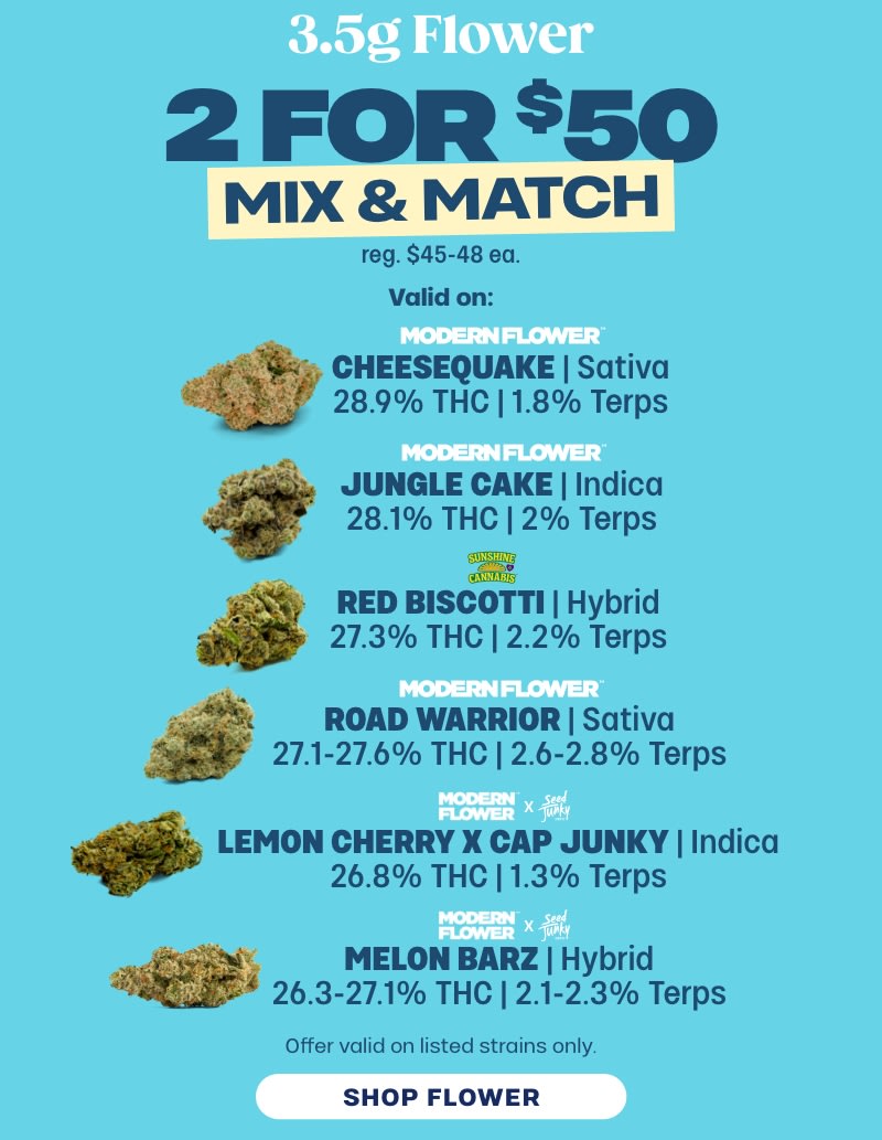Mon-Tue Deals: Offer is valid 10/6/2025 – 10/7/2025 in Florida locations only. Orders must be placed by end of day on 10/7/2025 to qualify, store hours may vary. For delivery orders, orders must be placed by 10/7/2025 to qualify for savings. Offer valid on select strains ands flavors listed only, no substitutions. Cannot be combined with any other patient discounts, coupon, product promotion or sale. Employees are eligible for promotion. βOffer has no cash value. Returns of any portion of the purchase will require equal forfeiture of offer or amount equal to offer. Trulieve, subsidiaries, affiliates, parent companies and third parties on behalf of Trulieve have the right to end or modify any offer at any time. Other restrictions may apply. Please see dispensary associate for more details. Product variety, availability, and THC% may vary by location.ββββ