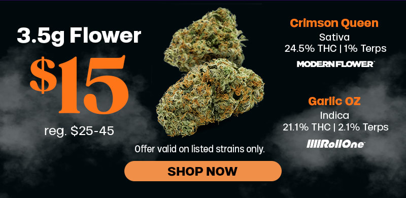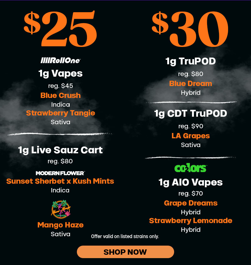 DailyΒ Deals |Β Friday:Β Offer is valid 10/31/2025 in Florida locations only. Orders must be placed by end of day on 10/31/2025 to qualify, store hours may vary. For delivery orders, orders must be placed by 10/31/2025 to qualify for savings. Offer valid on select strains listed only, no substitutions. Cannot be combined with any other patient discounts, coupon, product promotion or sale. Employees are eligible for promotion.Β βOffer has no cash value. Returns of any portion of the purchase will require equal forfeiture of offer or amount equal to offer. Trulieve, subsidiaries, affiliates, parent companies and third parties on behalf of Trulieve have the right to end or modify any offer at any time. Other restrictions may apply. Please see dispensary associate for more details. Product variety, availability, and THC% may vary by location.βββββ