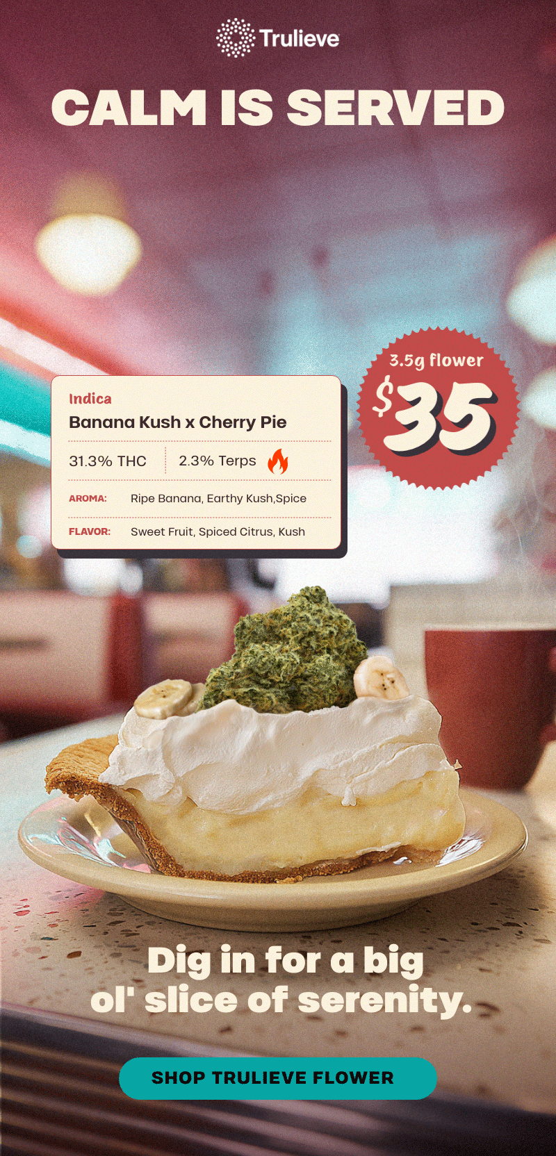 NEW | TL | Banana Pie: Offer is valid 11/30/2025 in Florida locations only. Orders must be placed by end of day on 11/30/2025 to qualify, store hours may vary. For delivery orders, orders must be placed by 11/30/2025 to qualify for savings. Cannot be combined with any other patient discounts, coupon, product promotion or sale. Employees are eligible for promotion. βOffer has no cash value. Returns of any portion of the purchase will require equal forfeiture of offer or amount equal to offer. Trulieve, subsidiaries, affiliates, parent companies and third parties on behalf of Trulieve have the right to end or modify any offer at any time. Other restrictions may apply. Please see dispensary associate for more details. Product variety, availability, and THC% may vary by location.βββββββΒ