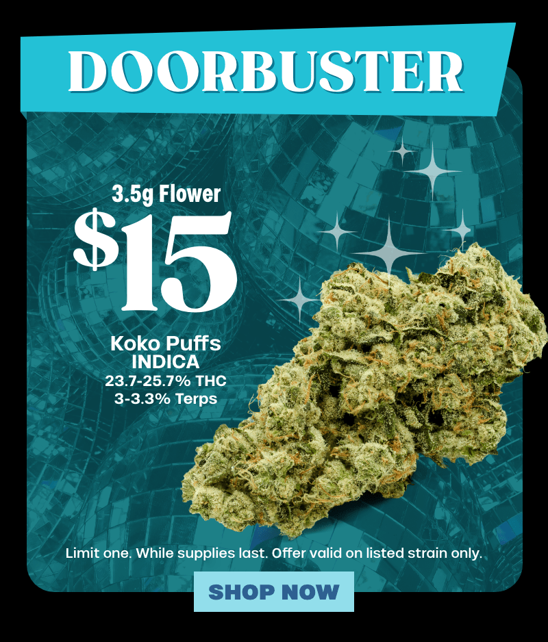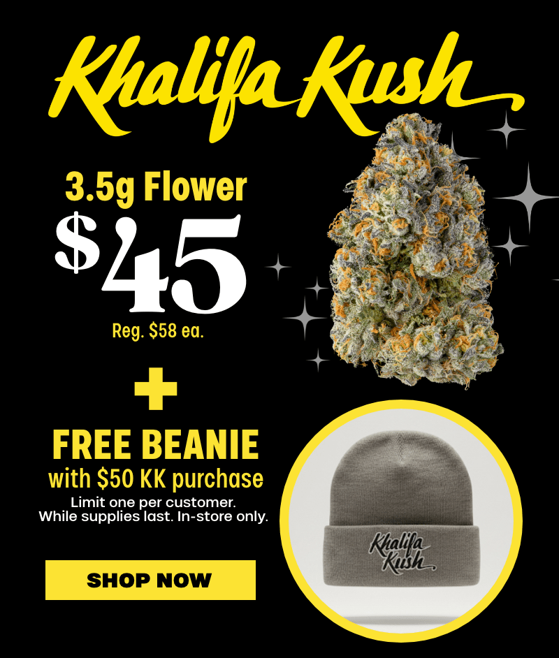 New Yearβs Doorbusterβs: Offer is valid 12/29/2025 at 10pm – 12/31/2025 in Florida locations only. Orders must be placed by end of day on 12/31/2025 to qualify, store hours may vary. For delivery orders, orders must be placed by 12/31/2025 to qualify for savings. $15 3.5g flower doorbuster is limited to one per customer, while supplies last. Offer valid on listed strains only, no substitutions. Cannot be combined with any other patient discounts, coupon, product promotion or sale. Gift with purchase available in-store while supplies last. Customer must purchase $50 worth of KK branded product to receive the gift. First come first serve, one gift per customer, while supplies lasts. Customer is only eligible for one gift with purchase per day. Employees are eligible for promotion. Offer has no cash value. Returns of any portion of the purchase will require equal forfeiture of offer or amount equal to offer. Trulieve, subsidiaries, affiliates, parent companies and third parties on behalf of Trulieve have the right to end or modify any offer at any time. Other restrictions may apply. Please see dispensary associate for more details. Product variety, availability, and THC% may vary by location.Β
