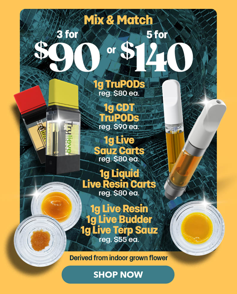 Fri-Sun Deals: Offer is valid 12/26/2025 – 12/28/2025 in Florida locations only. Orders must be placed by end of day on 12/28/2025 to qualify, store hours may vary. For delivery orders, orders must be placed by 12/28/2025 to qualify for savings. Offer valid on listed strains only, no substitutions. Cannot be combined with any other patient discounts, coupon, product promotion or sale. Employees are eligible for promotion. β€ŒOffer has no cash value. Returns of any portion of the purchase will require equal forfeiture of offer or amount equal to offer. Trulieve, subsidiaries, affiliates, parent companies and third parties on behalf of Trulieve have the right to end or modify any offer at any time. Other restrictions may apply. Please see dispensary associate for more details. Product variety, availability, and THC% may vary by location.β€Œβ€Œβ€Œβ€Œβ€Œβ€Œβ€ŒΒ