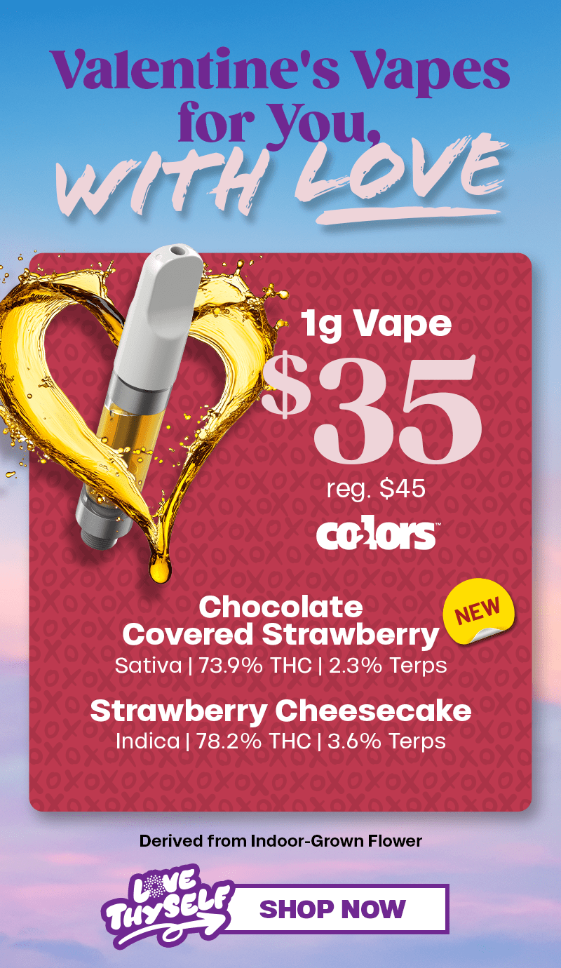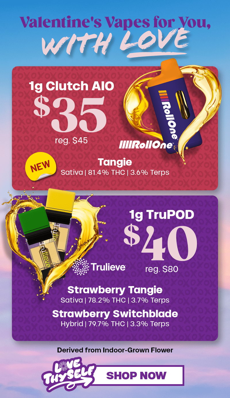 V-Day Themed Vapes: Offer is valid 2/10/2026 in Florida locations only. Orders must be placed by end of day on 2/10/2026 to qualify, store hours may vary. For delivery orders, orders must be placed by 2/10/2026 to qualify for savings. Offer valid on listed strains only, no substitutions. Cannot be combined with any other patient discounts, coupon, product promotion or sale. Employees are eligible for promotion. Offer has no cash value. Returns of any portion of the purchase will require equal forfeiture of offer or amount equal to offer. Trulieve, subsidiaries, affiliates, parent companies and third parties on behalf of Trulieve have the right to end or modify any offer at any time. Other restrictions may apply. Please see dispensary associate for more details. Product variety, availability, and THC% may vary by location.