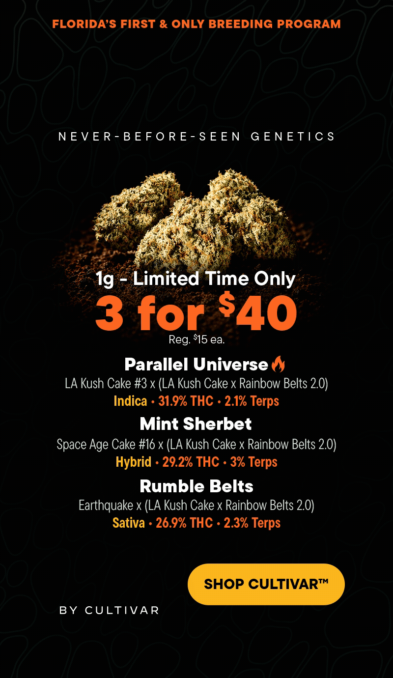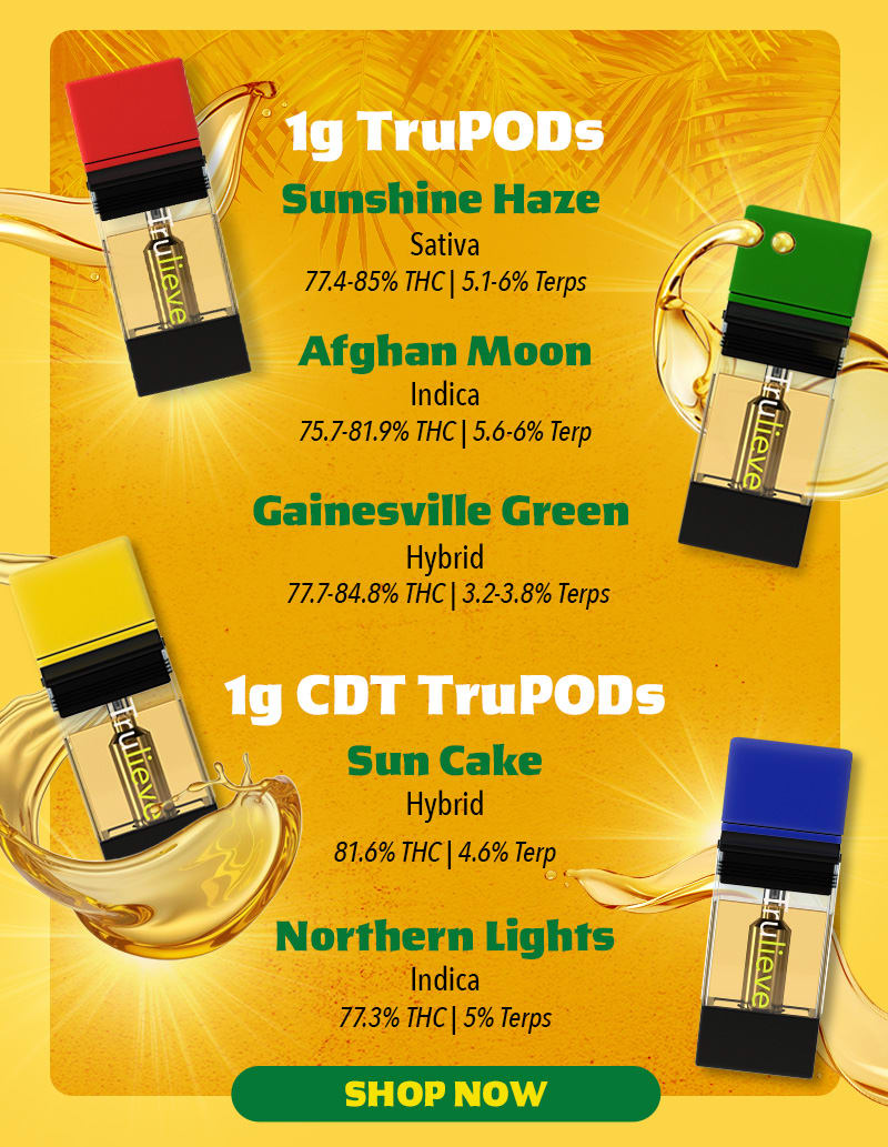 Fri-Sat Deals: Offer is valid 4/24/2026 – 4/25/2026 in Florida locations only. Orders must be placed by end of day on 4/25/2026‌ to qualify, store hours may vary. For delivery orders, orders must be placed by 4/25/2026‌ to qualify for savings. Cannot be combined with any other patient discounts, coupon, product promotion or sale. Employees are eligible for promotion. Offer has no cash value. Returns of any portion of the purchase will require equal forfeiture of offer or amount equal to offer. Trulieve, subsidiaries, affiliates, parent companies and third parties on behalf of Trulieve have the right to end or modify any offer at any time. Other restrictions may apply. Please see dispensary associate for more details. Product variety, availability, and THC% may vary by location.