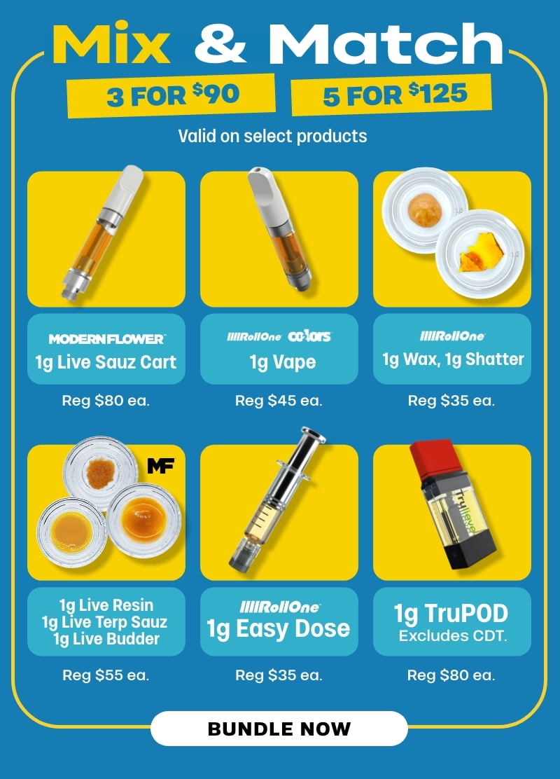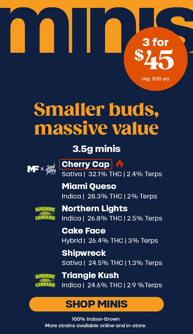 minis: Offer is valid 11/30/2025 at 4pm – 12/1/2025 in Florida locations only. Orders must be placed by end of day on 12/1/2025 to qualify, store hours may vary. For delivery orders, orders must be placed by 12/1/2025 to qualify for savings. Cannot be combined with any other patient discounts, coupon, product promotion or sale. Employees are eligible for promotion. Offer has no cash value. Returns of any portion of the purchase will require equal forfeiture of offer or amount equal to offer. Trulieve, subsidiaries, affiliates, parent companies and third parties on behalf of Trulieve have the right to end or modify any offer at any time. Other restrictions may apply. Please see dispensary associate for more details. Product variety, availability, and THC% may vary by location.β€Œβ€Œβ€Œβ€Œβ€Œβ€Œβ€Œβ€Œ