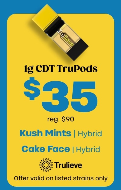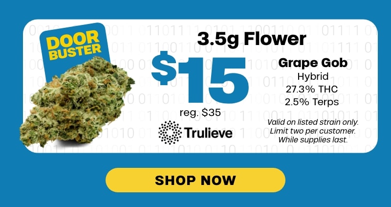 Cyber Monday | Deals start at 10pm: Offer is valid 11/30/2025 at 10pm – 12/1/2025 in Florida locations only. Orders must be placed by end of day on 12/1/2025 to qualify, store hours may vary. For delivery orders, orders must be placed by 12/1/2025 to qualify for savings. Offer valid on listed strains and flavors only, no substitutions. Grape Gob 3.5g flower doorbuster is limited to 2 per customer. Cannot be combined with any other patient discounts, coupon, product promotion or sale. Employees are eligible for promotion. β€ŒOffer has no cash value. Returns of any portion of the purchase will require equal forfeiture of offer or amount equal to offer. Trulieve, subsidiaries, affiliates, parent companies and third parties on behalf of Trulieve have the right to end or modify any offer at any time. Other restrictions may apply. Please see dispensary associate for more details. Product variety, availability, and THC% may vary by location.