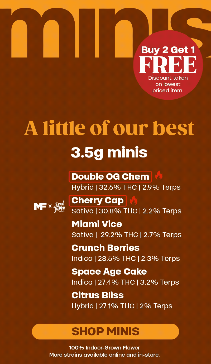 minis: Offer is valid 11/16/2025 at 6pm – 11/18/2025 in Florida locations only. Orders must be placed by end of day on 11/18/2025 to qualify, store hours may vary. For delivery orders, orders must be placed by 11/18/2025 to qualify for savings. Discount taken on lowest priced item.β Cannot be combined with any other patient discounts, coupon, product promotion or sale. Employees are eligible for promotion. βOffer has no cash value. Returns of any portion of the purchase will require equal forfeiture of offer or amount equal to offer. Trulieve, subsidiaries, affiliates, parent companies and third parties on behalf of Trulieve have the right to end or modify any offer at any time. Other restrictions may apply. Please see dispensary associate for more details. Product variety, availability, and THC% may vary by location.