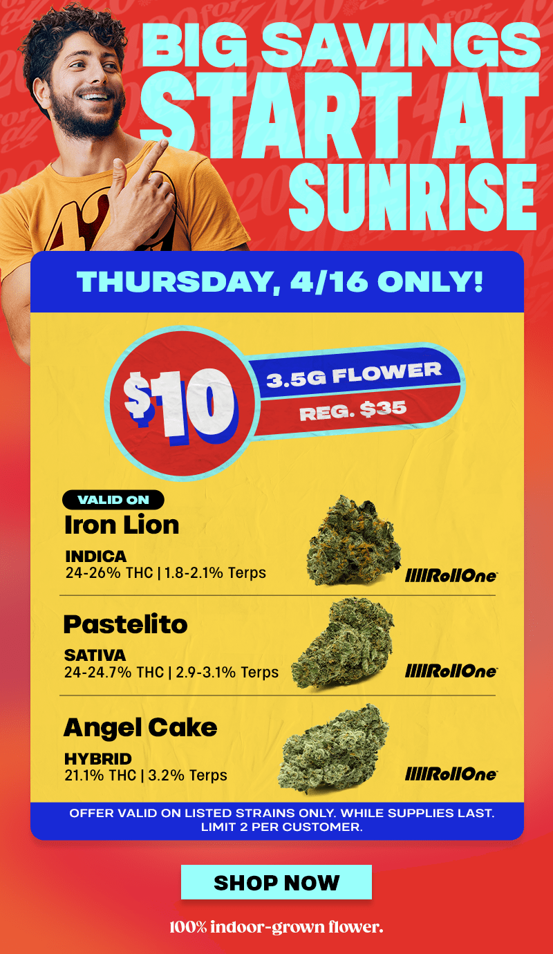 $10 3.5g Flower | Thursday: Offer is valid 4/16/2026 in Florida locations only. Orders must be placed by end of day on 4/16/2026 to qualify, store hours may vary. For delivery orders, orders must be placed by 4/16/2026 to qualify for savings. Offer valid on listed strains only, no substitutions. Limit 2 per customer. Cannot be combined with any other patient discounts, coupon, product promotion or sale. Offer has no cash value. Returns of any portion of the purchase will require equal forfeiture of offer or amount equal to offer. Trulieve, subsidiaries, affiliates, parent companies and third parties on behalf of Trulieve have the right to end or modify any offer at any time. Other restrictions may apply. Please see dispensary associate for more details. Product variety, availability, and THC% may vary by location.β€Œβ€Œ