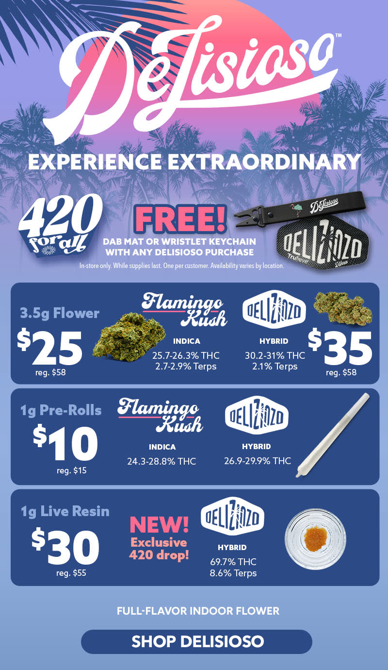 420: Delisioso: Offer is valid 4/16/2026 in Florida locations only. Orders must be placed by end of day on 4/16/2026β€Œ to qualify, store hours may vary. For delivery orders, orders must be placed by 4/16/2026β€Œ to qualify for savings. Gift with purchase available in-store while supplies last. Customer must purchase a Delisioso product to receive the free gift. First come first serve, one gift per patient. Customer is only eligible for one gift with purchase per day. β€ŒCannot be combined with any other patient discounts, coupon, product promotion or sale. Employees are eligible for promotion. Offer has no cash value. Returns of any portion of the purchase will require equal forfeiture of offer or amount equal to offer. Trulieve, subsidiaries, affiliates, parent companies and third parties on behalf of Trulieve have the right to end or modify any offer at any time. Other restrictions may apply. Please see dispensary associate for more details. Product variety, availability, and THC% may vary by location. β€Œβ€Œ